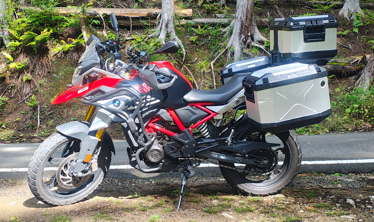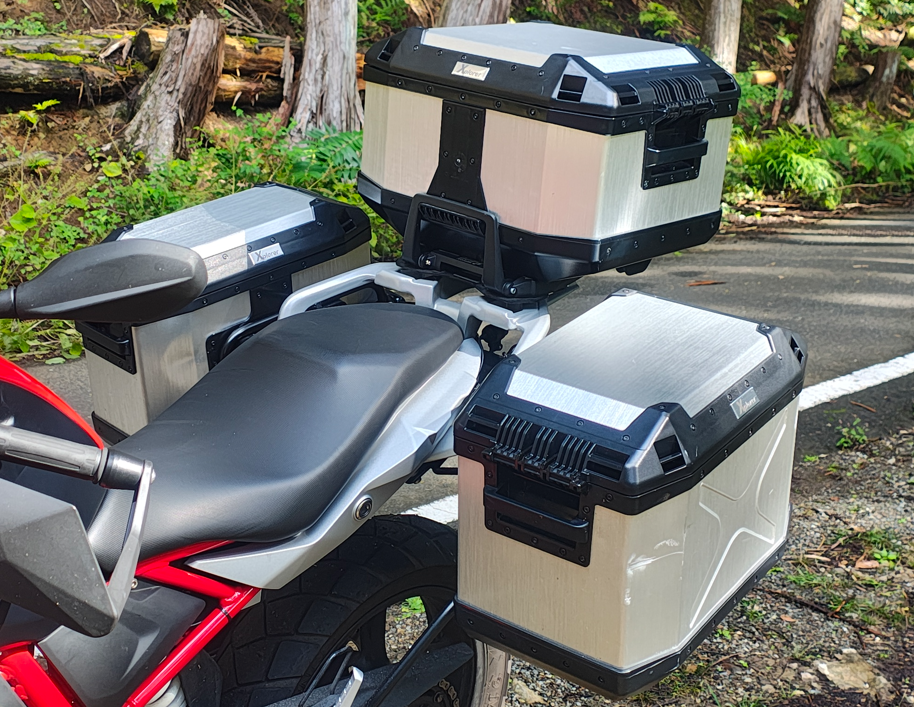 トップx1とサイドx2の,所謂「フルパニア」構成. これを付けるだけで一気に旅してます感を出すことが可能. モデルはヘプコ&ベッカーのXplorerで,トップ:45L/左:40L/右:30L.